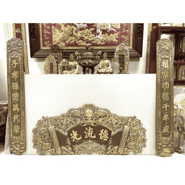 Cuốn thư câu đối bẳng đồng là vật phẩm trang trí cho gian thờ thêm phần sang trọng và linh thiêng. Nhìn vào bộ hoành phi với mẫu mã, hoa văn tỉ mỉ, tinh tế ta thấy được vẻ đẹp hoài cổ như gian thờ thời xưa của ông cha ta. Bộ cuốn thư câu đối bằng đồng thể hiện được gia phong của gia đình, dòng tộc, mang chuẩn mực, lối sống của người Việt ta.