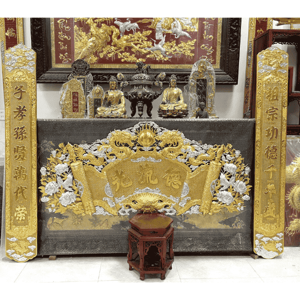 Cuốn thư câu đối bẳng đồng là vật phẩm trang trí cho gian thờ thêm phần sang trọng và linh thiêng. Nhìn vào bộ hoành phi với mẫu mã, hoa văn tỉ mỉ, tinh tế ta thấy được vẻ đẹp hoài cổ như gian thờ thời xưa của ông cha ta. Bộ cuốn thư câu đối bằng đồng thể hiện được gia phong của gia đình, dòng tộc, mang chuẩn mực, lối sống của người Việt ta.