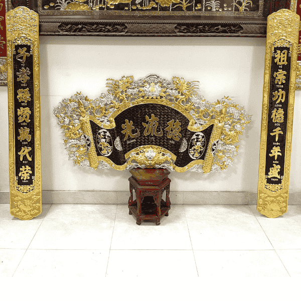Cuốn thư câu đối bẳng đồng là vật phẩm trang trí cho gian thờ thêm phần sang trọng và linh thiêng. Nhìn vào bộ hoành phi với mẫu mã, hoa văn tỉ mỉ, tinh tế ta thấy được vẻ đẹp hoài cổ như gian thờ thời xưa của ông cha ta. Bộ cuốn thư câu đối bằng đồng thể hiện được gia phong của gia đình, dòng tộc, mang chuẩn mực, lối sống của người Việt ta.
