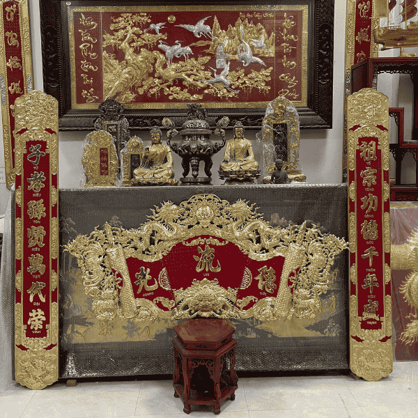 Cuốn thư câu đối bẳng đồng là vật phẩm trang trí cho gian thờ thêm phần sang trọng và linh thiêng. Nhìn vào bộ hoành phi với mẫu mã, hoa văn tỉ mỉ, tinh tế ta thấy được vẻ đẹp hoài cổ như gian thờ thời xưa của ông cha ta. Bộ cuốn thư câu đối bằng đồng thể hiện được gia phong của gia đình, dòng tộc, mang chuẩn mực, lối sống của người Việt ta.