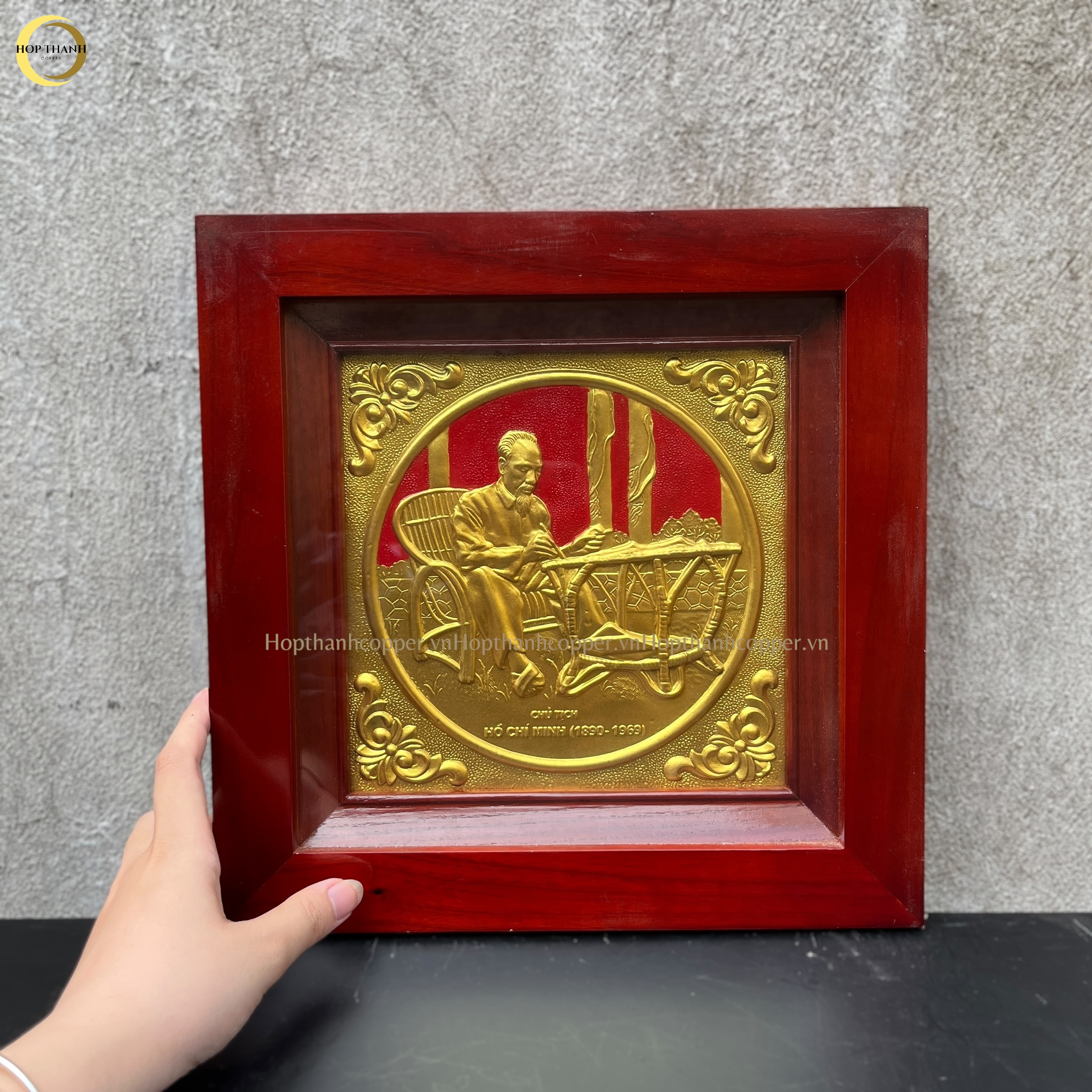 TRANH BÁC HỒ NGỒI GHẾ MÂY BẰNG ĐỒNG DÁT VÀNG - KÍCH THƯỚC 38X38CM