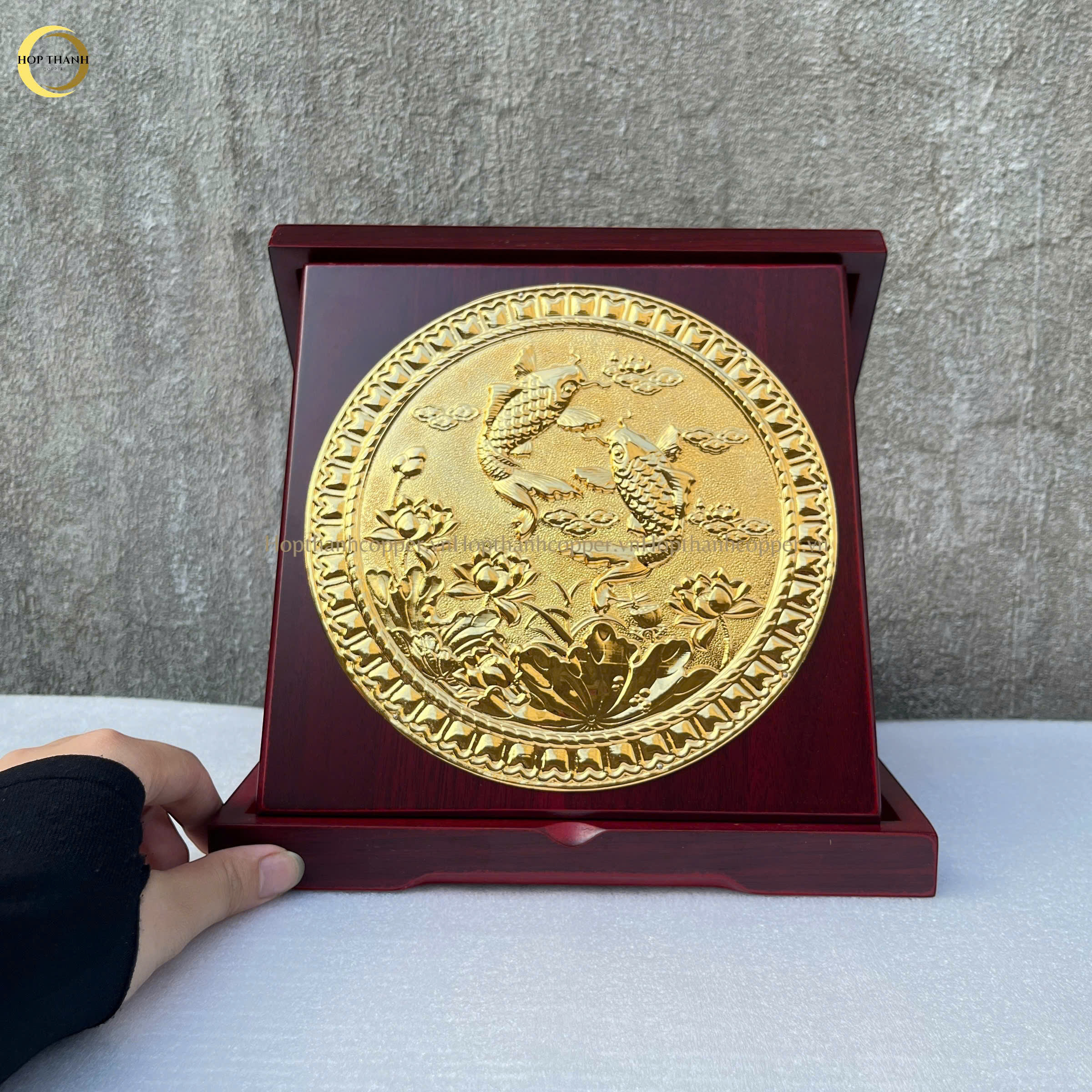 TRANH CÁ CHÉP HOA SEN - SONG NGƯ CÁT HẠNH BẰNG ĐỒNG MẠ VÀNG 24K (ĐƯỜNG KÍNH 24X24CM)
