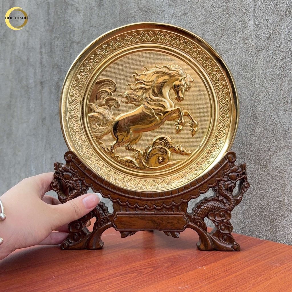 Các chi tiết trên đĩa được chạm khắc tinh xảo, thể hiện hình ảnh một con ngựa đang phi nước đại, mang ý nghĩa vượt qua khó khăn để đạt được thành công.