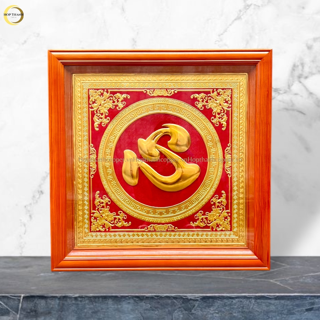 Nguyên liệu là đồng vàng nguyên tấm nhập khẩu Hàn Quốc, kết hợp kỹ thuật dát vàng tinh xảo. Chữ Tâm Hán tự nổi bật ở trung tâm, vững chãi và trang nghiêm, đặt trên nền hoa văn gấm, họa tiết hoa sen biểu trưng cho sự thanh cao, cùng hoa văn bốn góc được hoàn thiện sắc nét – tất cả tạo nên một tổng thể hài hòa giữa nghệ thuật, phong thủy và chiều sâu tư tưởng.