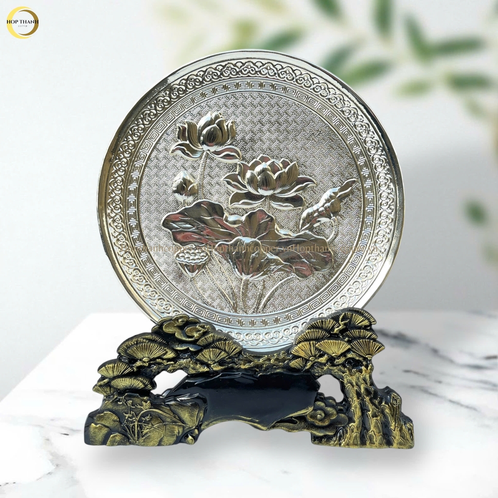 TRANH ĐĨA HOA SEN BẰNG ĐỒNG MẠ BẠC - TRANH QUÀ TẶNG ĐỂ BÀN (KÍCH THƯỚC 20CM)