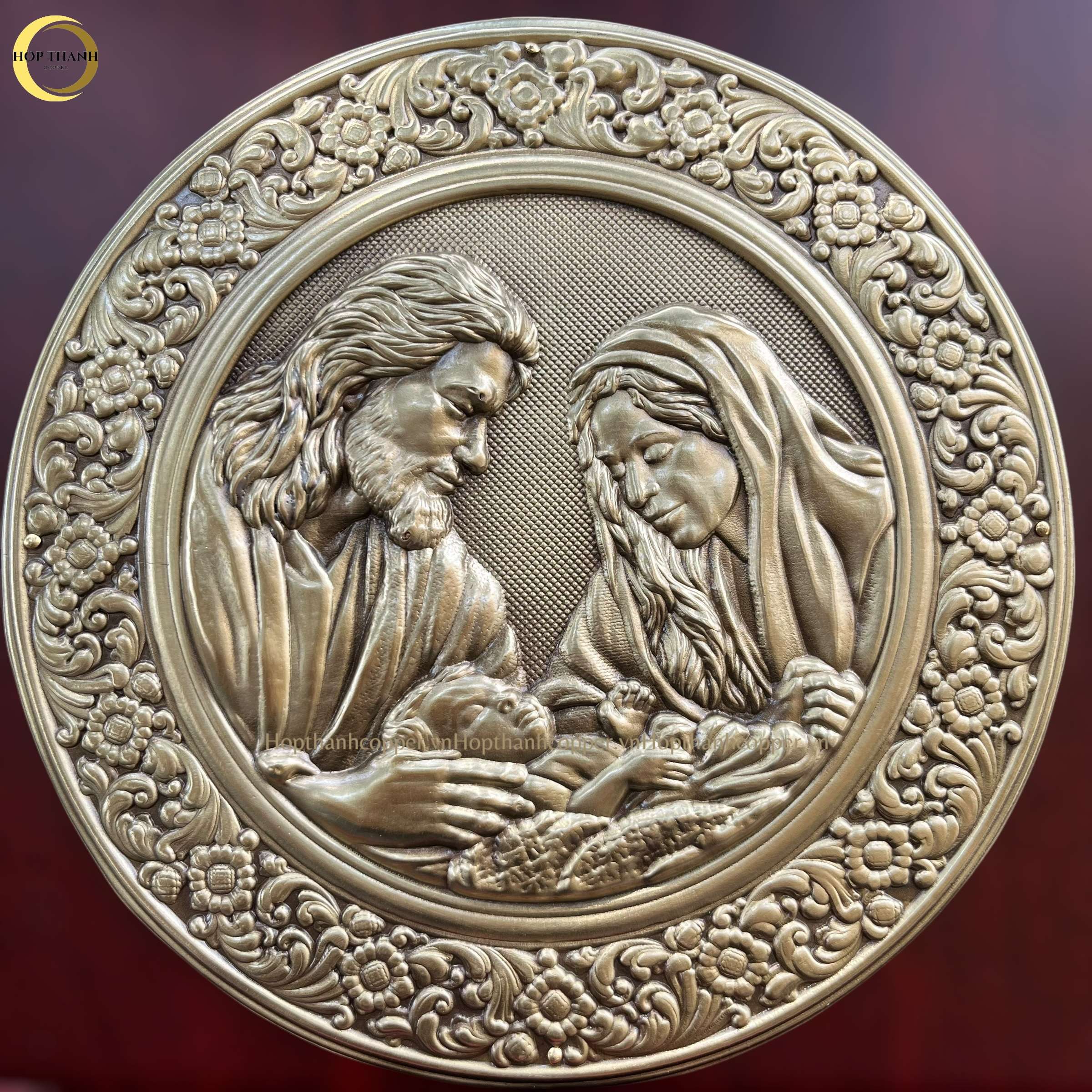 Thánh Giuse và Đức Maria ôm lấy Hài Nhi Giêsu một cách âu yếm, biểu hiện của tình yêu gia đình và sự bảo bọc thiêng liêng.