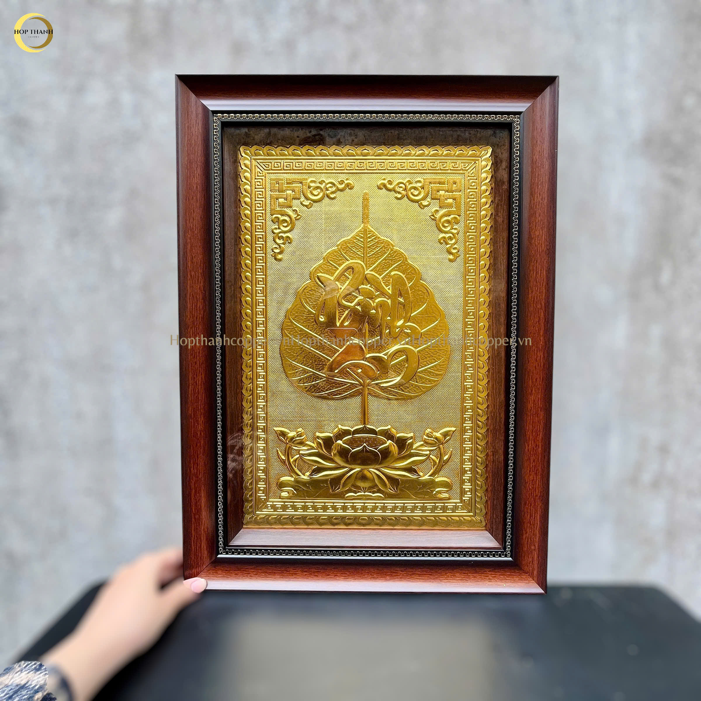 TRANH LÁ BỒ ĐỀ CHỮ BÌNH AN BẰNG ĐỒNG DÁT VÀNG - KÍCH THƯỚC 38X54CM