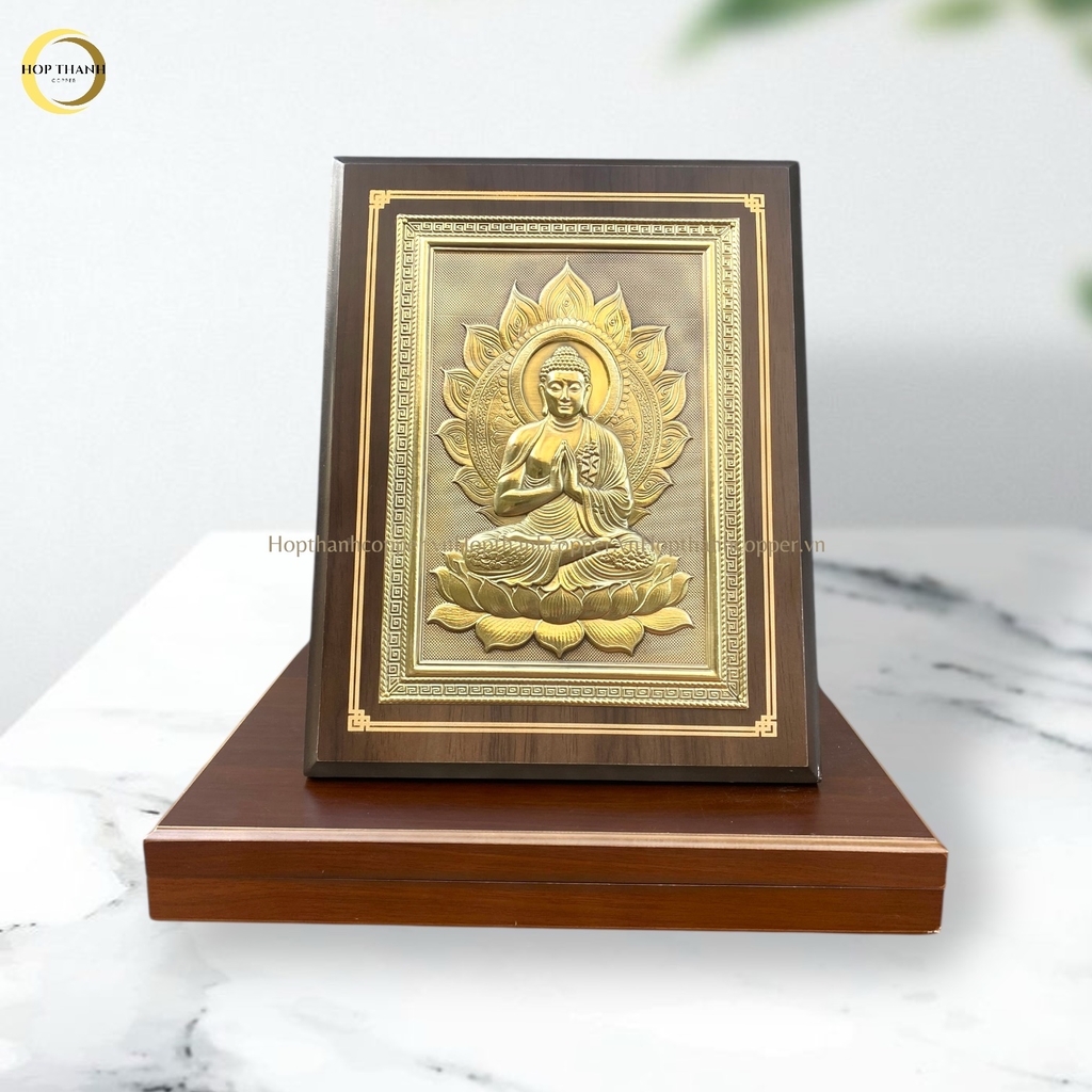Bức tranh đồng Phật Thích Ca được chế tác thủ công tinh xảo trên nền đồng vàng cao cấp, thể hiện hình ảnh Đức Phật trong tư thế tọa thiền trên đài sen, tay kết ấn trang nghiêm, gương mặt hiền từ và an lạc. Phía sau là hào quang rực rỡ tượng trưng cho trí tuệ, giác ngộ và ánh sáng từ bi lan tỏa.
