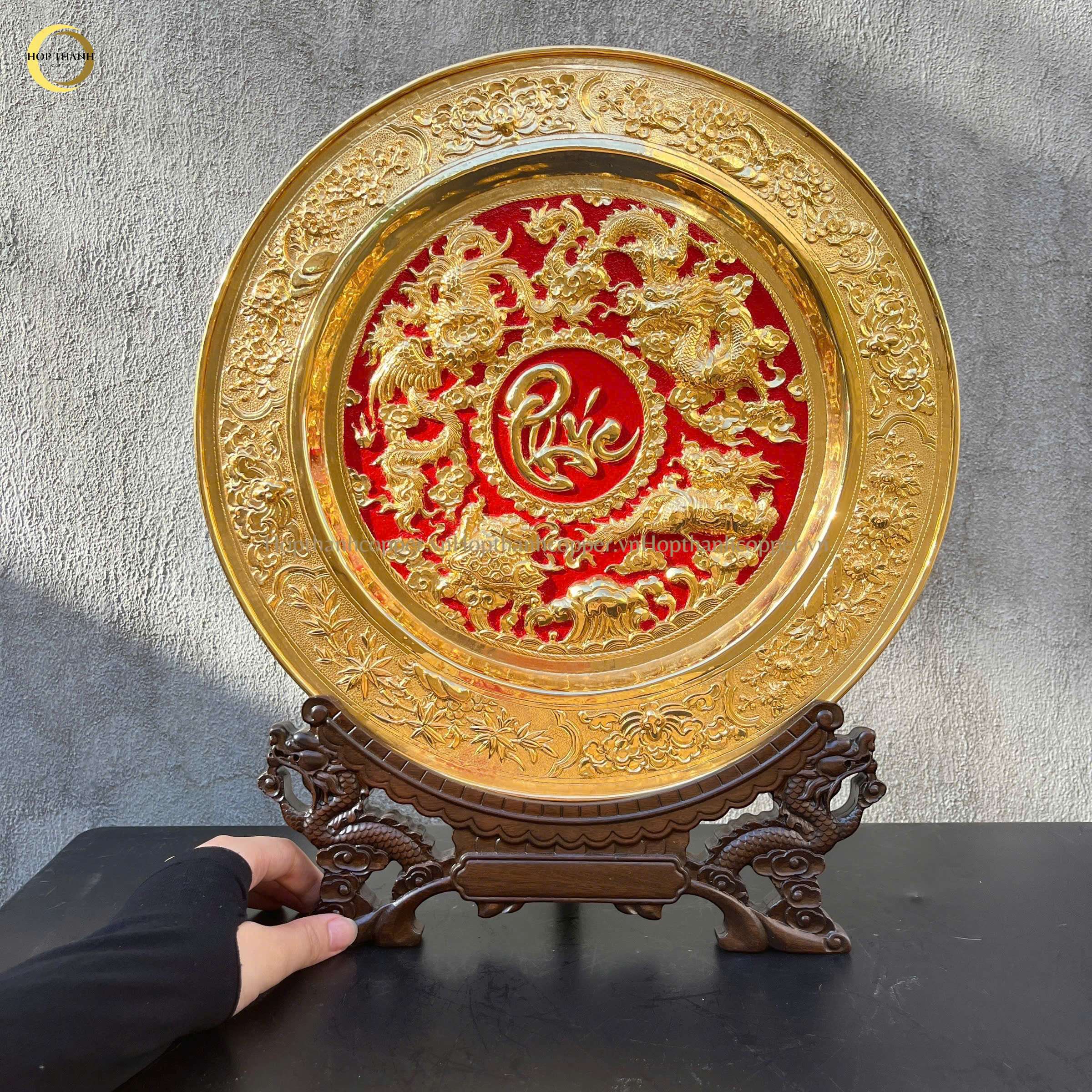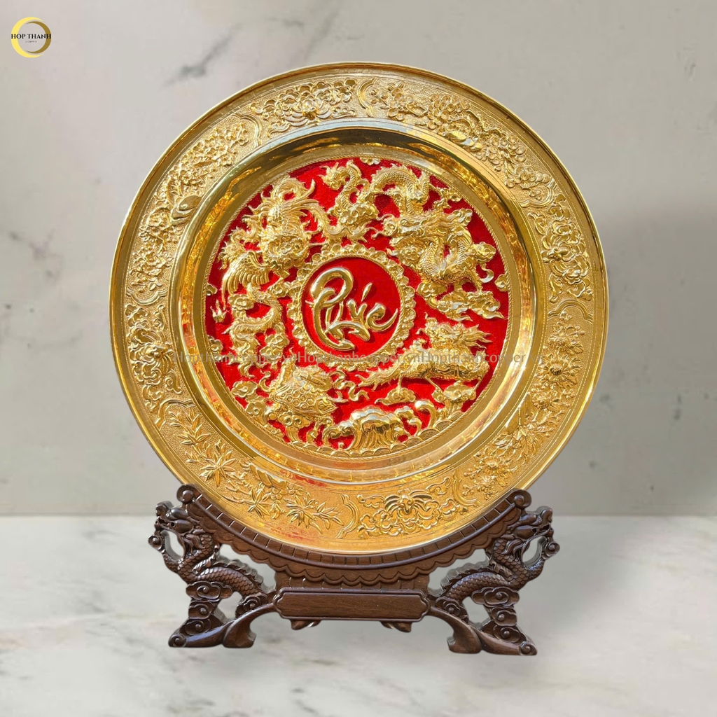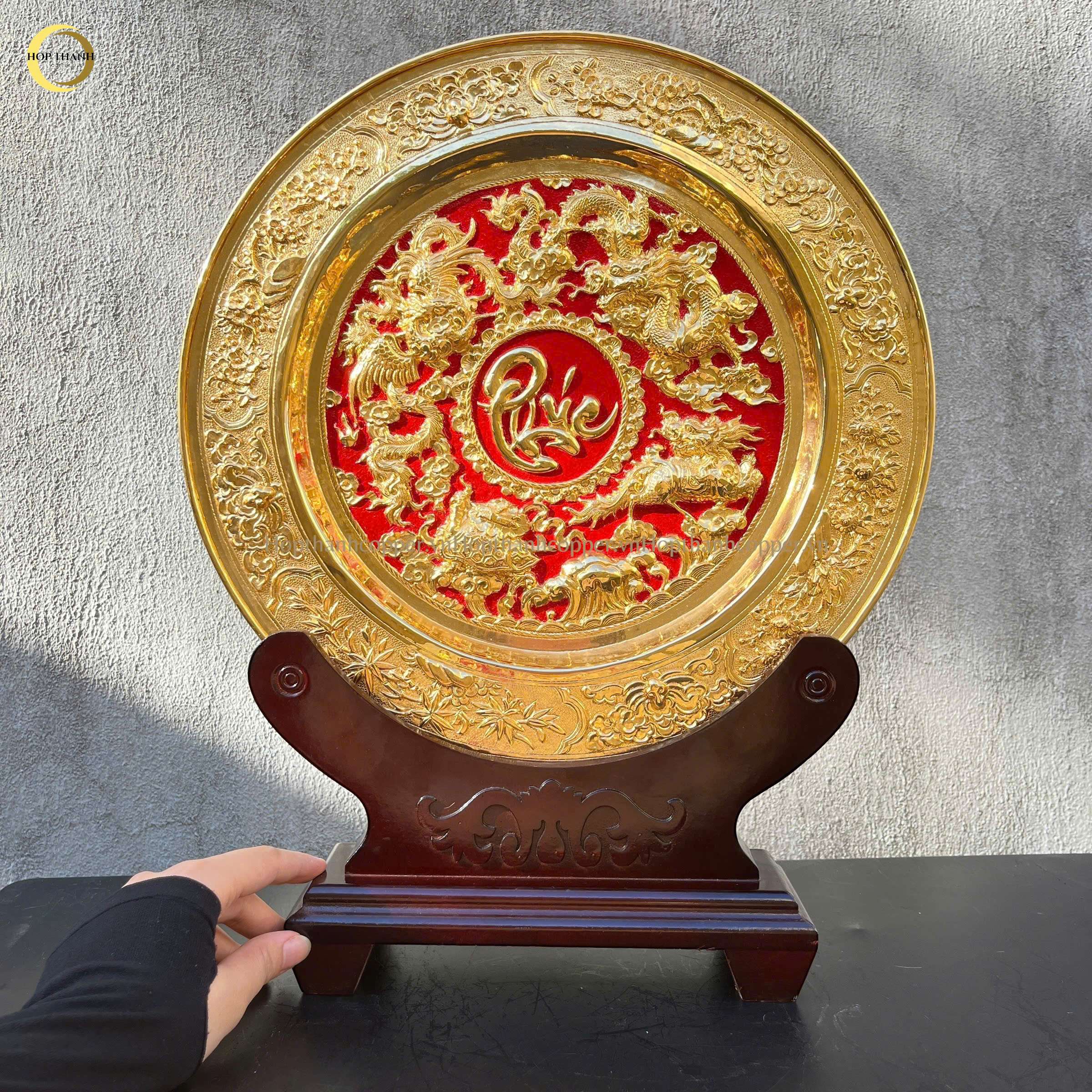 Chất liệu: Rồng được chạm khắc nổi trên nền đồng, mạ vàng 24K sắc sảo, toát lên vẻ sang trọng, uy nghi.